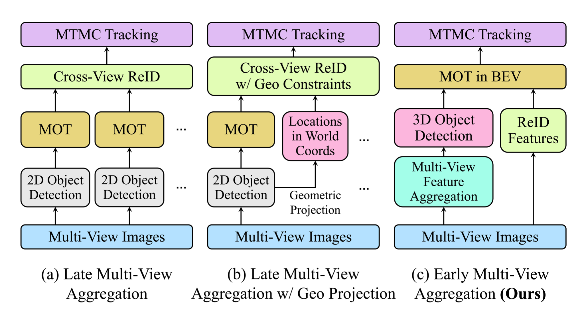 그림은 Late aggregation방법과 Early aggregation방법을 나타낸 도식입니다. Late aggregation같은 경우 각 camera의 image마다 detection을 수행하고 나온결과를 tracking 알고리즘에 넣고 (보통은 filter기반) 나온 결과물들을 ReID 매칭을 통해 전체 tracking을 진행합니다. 이에 반해 논문에서 제시한 Early aggregation방법은 Multi-view Featrue aggregation을 진행하고 (BEV fusion을 이야기함) 나온 3D detection결과물과 각각의 ReID feature들을 Tracking 알고리즘에 넣어(SUSHI- learnable base)전체 tracking을 수행합니다.
