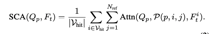 이 후에 SCA - spatial cross-attention이라고 하여 위의 수식과 같습니다. $Q_{p}$는 BEV space에서의 query(learnable), $V_{hit}$은 reference point가 projection된 camera들, $P_{p,i,j}$는 BEV상에서 p지점, i번째 카메라 ,j번째 point를 i카메라에 projection한 위치입니다. Attn은 deformable attention을 의미합니다.