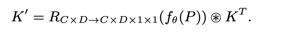 inference time에서는 auxiliary network이 앞서 언급한대로 re-parameterization합니다(YOLO classfication head). 이를 수식으로 나타낸건데 f(p)는 기존 학습된 text embedding이고 [C,D] 이를 reshape해서 conv커널처럼 CxDx1x1형태로 만듭니다(클래스 마다 1x1 conv를 생성하는 셈). 여기서 기존 kernel weight를 transpose 한후에 결합해서 최종 [C,D,1,1]을 만듭니다.