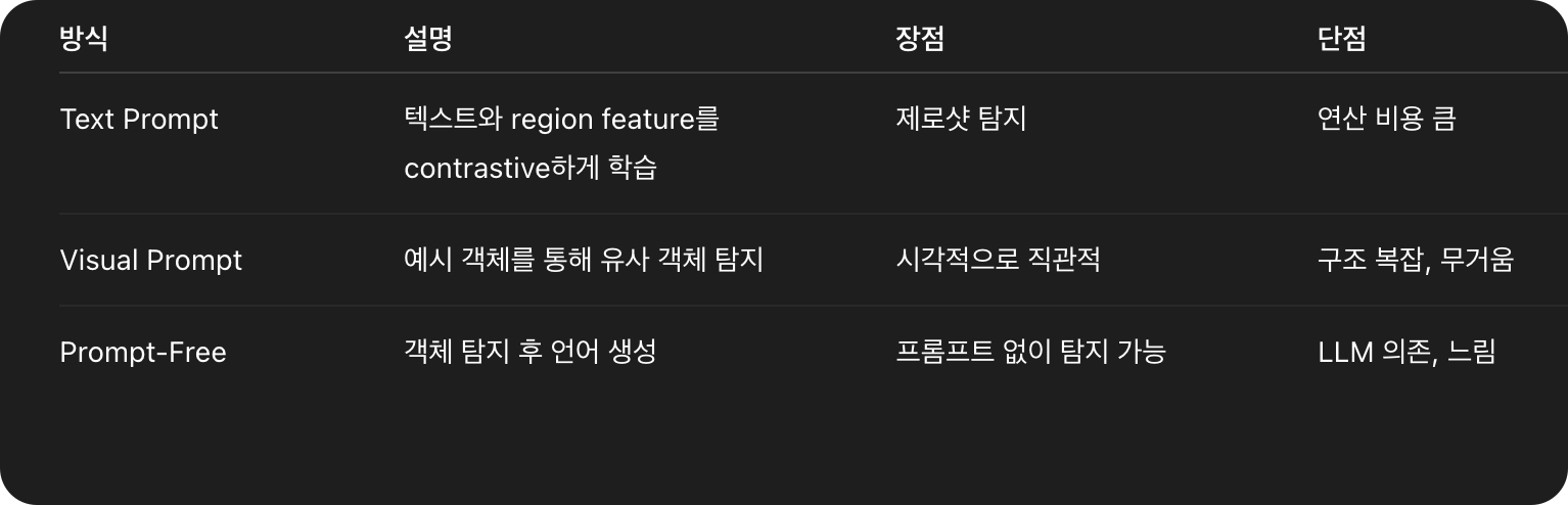 마지막으로 prompt-free방법인데 prompt없이 모든 객체를 탐지하고 해당 region에서 language모델을 이용해 이름을 생성하는 방식으로 detection -> describe방식입니다.